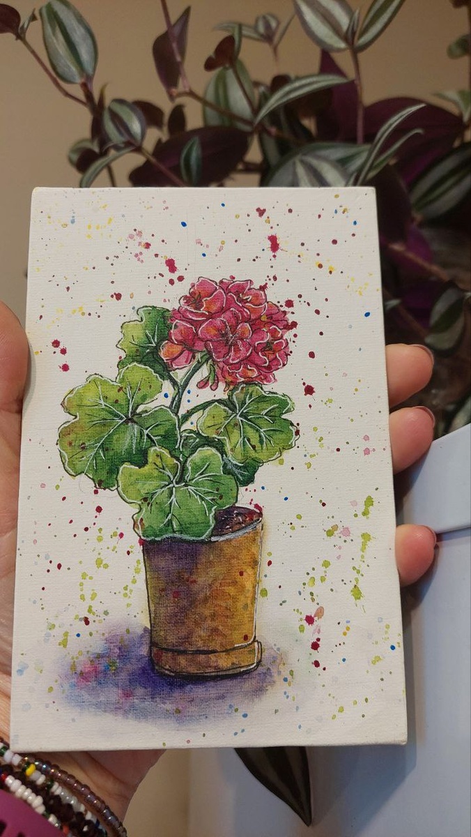 Акварель никак у меня на холстик не хочет ложится, хотя холст для акварели...🤔 Надеюсь я подружу их🙏🏻 А пока основные ляпы прикрыла линером и все замаскировала брызгами 🤭