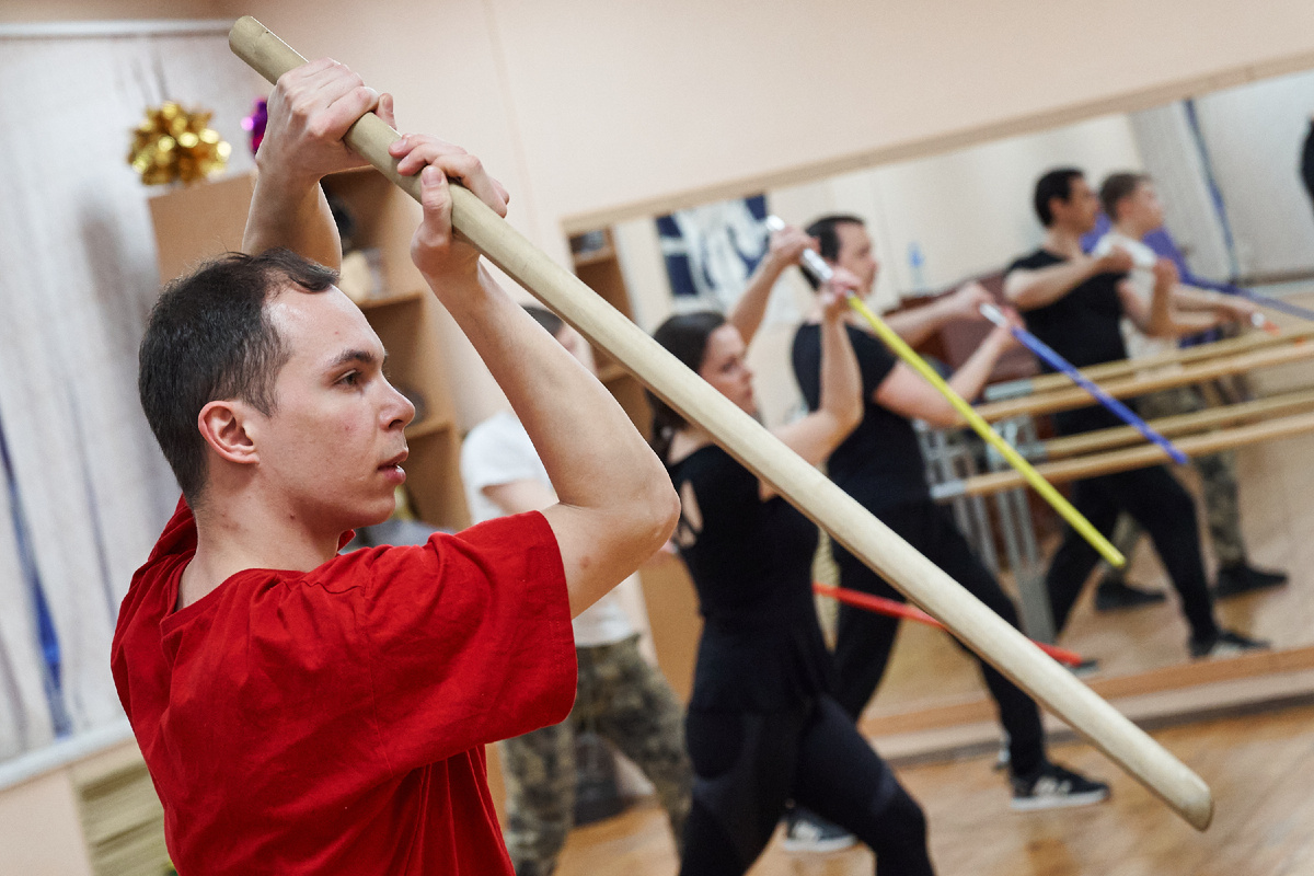 Несмотря на то, что сценическое фехтование – постановка, имитация реального боя, студийцы изучают фехтовальные приемы по методикам подготовки олимпийских чемпионов. «Чтобы исполнитель фехтовальной сцены мог выполнить тот или иной прием правдоподобно в постановке, он должен уметь выполнить этот прием и в учебном спарринге», – объясняет Даниил.