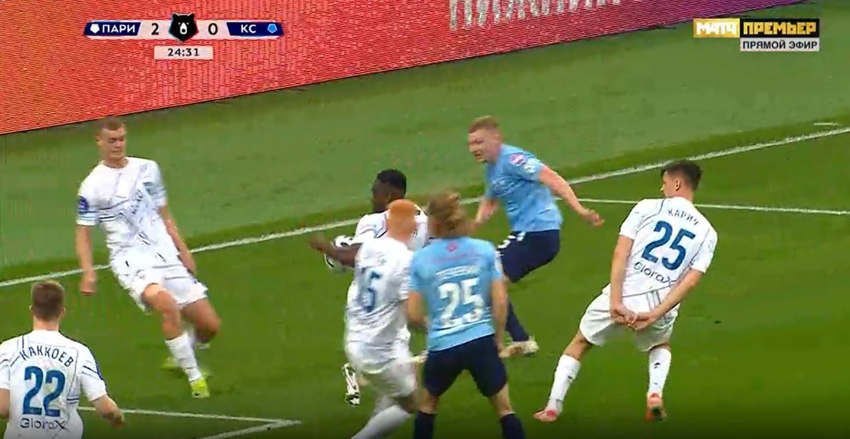 Пари Н-Н-Крылья Советов 25 мин. Правильное решение принимает Зияков и продолжает игру. Мяч от партнера по команде который играет в мяч попадает в руку. Правильное решение. Продолжить игру