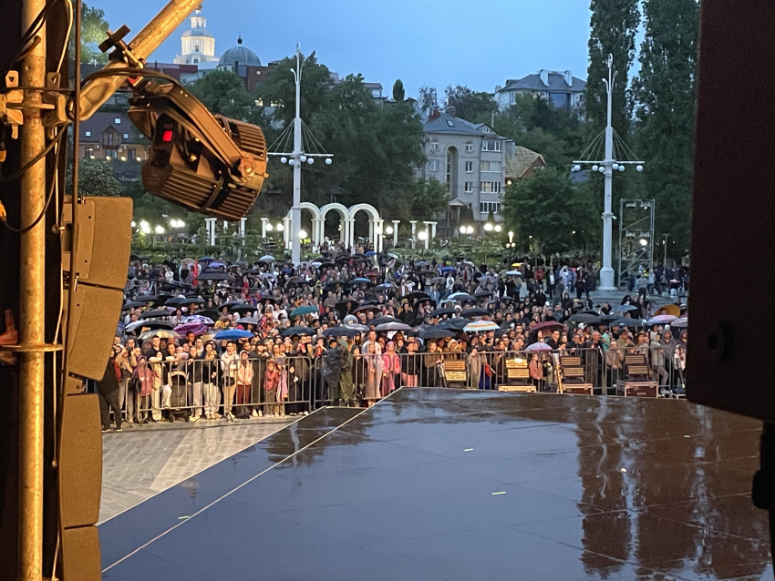 В это же время на Адмиралтейке начался яркий концерт к 9 Мая. Но погода не смогла испортить настроение праздника. Артисты выступали под дождем, а воронежцы вооружились зонтиками и пришли на выступление.