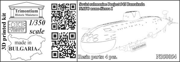 Болгарская OKB Grigorov выпустила на 3D-принтере модель советской подводной лодки проекта 945 в масштабе 1/350: Soviet submarine project Project 945 Barrakuda (NATO name Sierra I) - каталожный номер N350054