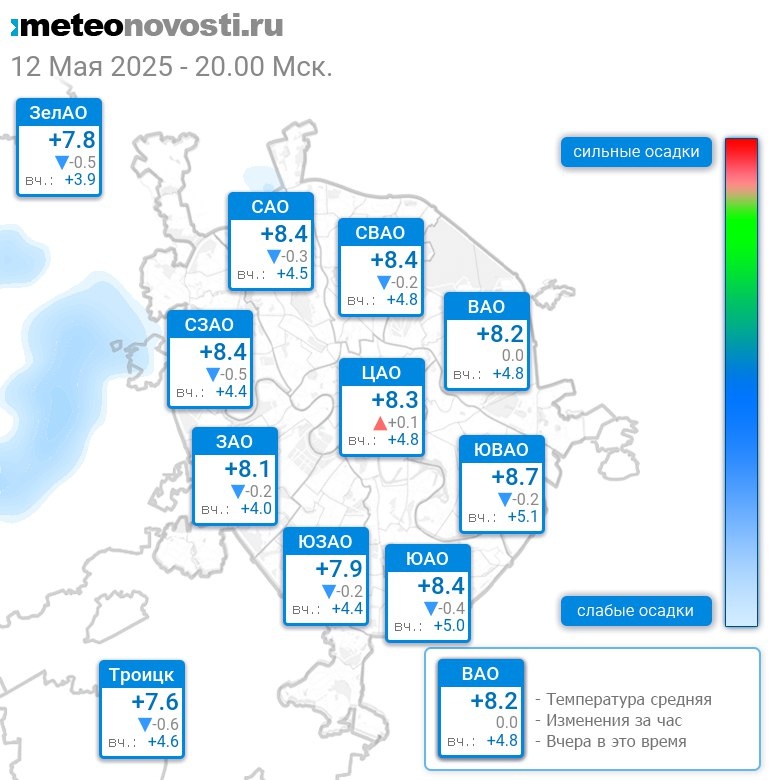В 20:00 в Москве было от +7°C до +9.3°C, средняя температура +8.2°C #погода #Москва #весна #температура #12мая #понедельник