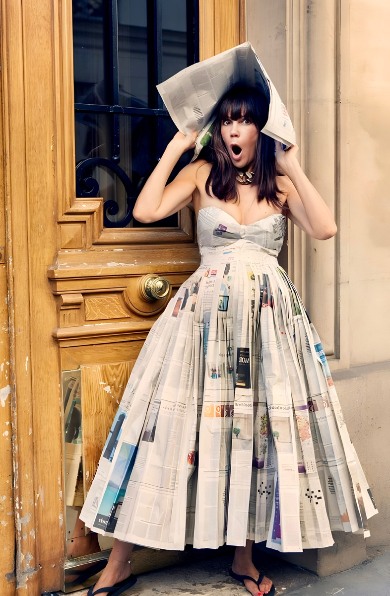 Первопроходцем стала Эльза Скиапарелли — ещё в 1935 она создавала платья, будто собранные из газетных полос. Это были не просто наряды, а текстовые коллажи: заметки на подоле, заголовки на лифе — будто персональный дневник, отпечатанный шрифтами той эпохи.