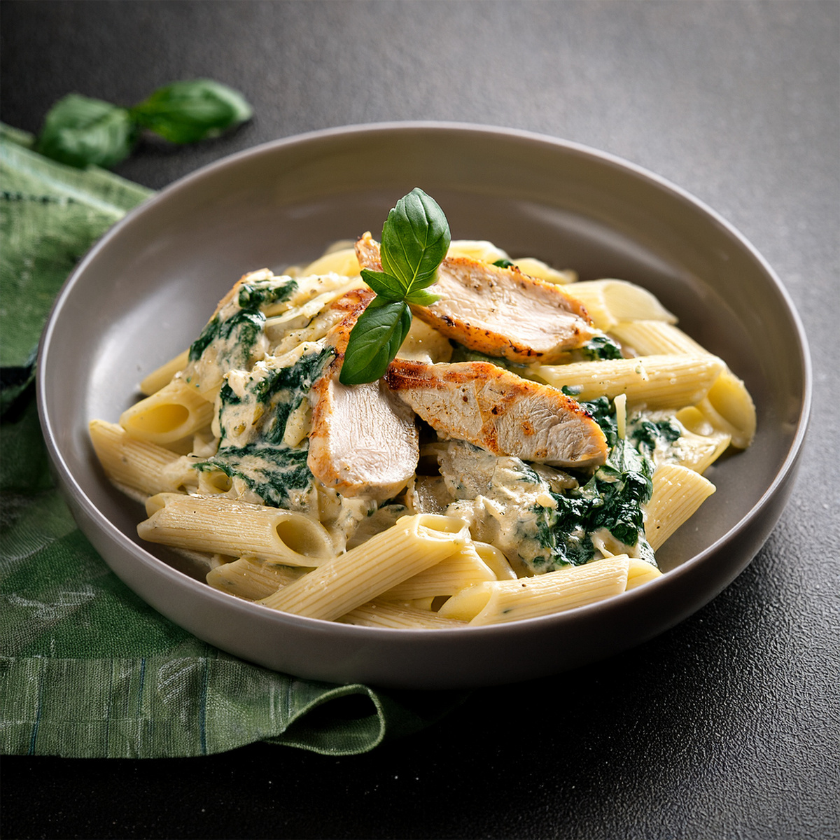 Куриное филе обжарить с чесноком, добавить шпинат и сливки — протушить 2–3 мин. Смешать с отварными макаронами. КБЖУ: 435 ккал | Б: 30 г | Ж: 15 г | У: 35 г Что нужно: Как готовить:
