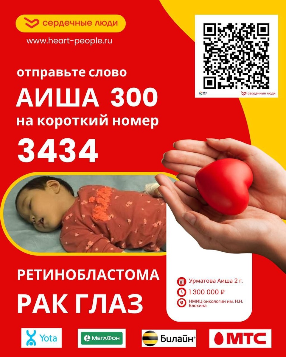 Помогите спасти жизнь Аише из Киргизстана! В свои 2,5 годика эта маленькая девочка столкнулась с невероятно жестоким испытанием – раком обоих глаз. Мир, полный красок и чудес, может навсегда остаться для нее недоступным, если мы не придем на помощь. Представьте себе, как тяжело ребенку, который только начал познавать мир, осознать, что его зрение ускользает. Аиша хочет видеть улыбки мамы и папы, играть с друзьями, разглядывать яркие цветы и наблюдать за порханием бабочек. Она хочет просто жить, как все дети. Но для этого ей необходима дорогостоящая операция и длительное лечение за границей. В Киргизстане, к сожалению, нет необходимого оборудования и специалистов, способных справиться с таким сложным случаем. У семьи Аиши нет средств, чтобы самостоятельно оплатить лечение, которое может спасти ей зрение и, возможно, жизнь. Каждый из нас может стать частью чуда и подарить Аише шанс увидеть мир своими глазами. Любая, даже самая небольшая сумма, приблизит ее к выздоровлению. Давайте объ