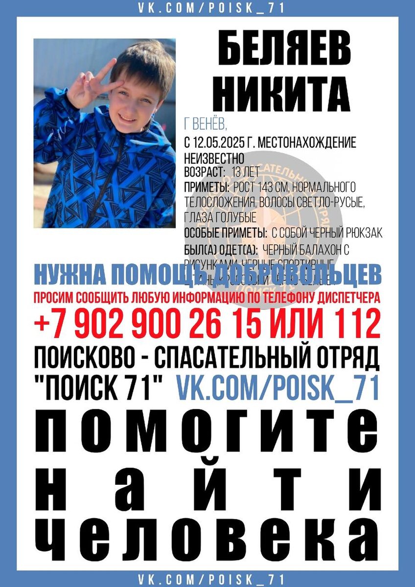 Внимание!!! Максимальный репост!!! Помогите найти подростка !!! Пропал: БЕЛЯЕВ НИКИТА, 13 лет Проживает: г Венёв С 12.05.2025 г. местонахождение неизвестно. Приметы: рост 143 см, нормального телосложения,светло- русые волосы,глаза голубые. С собой черный рюкзак. Одет: черный балахон,черные спортивные штаны, чёрно-белые кроссовки Просьба всем кому, что-либо известно сообщить по телефону диспетчера 8(902)900-26-15 или 112.