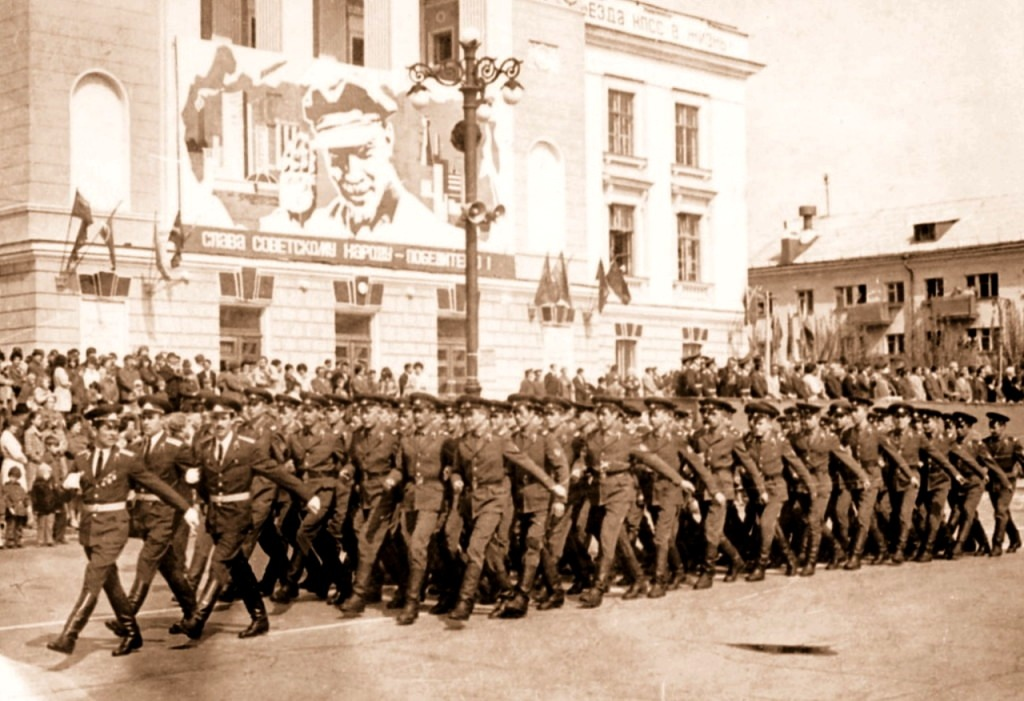 Шагает строй военных у ДК Маяк.