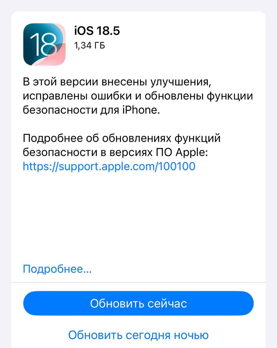 Там вышло обновление iOS 18.5 и сопутствующих систем. Обещают исправление ошибок и ничего более серьезного. Как обычно, рекомендуем день-другой подождать и посмотреть на реакцию первых торопыг. А если вы из числа последних, то хотя бы сперва сделайте бэкап. @fixed