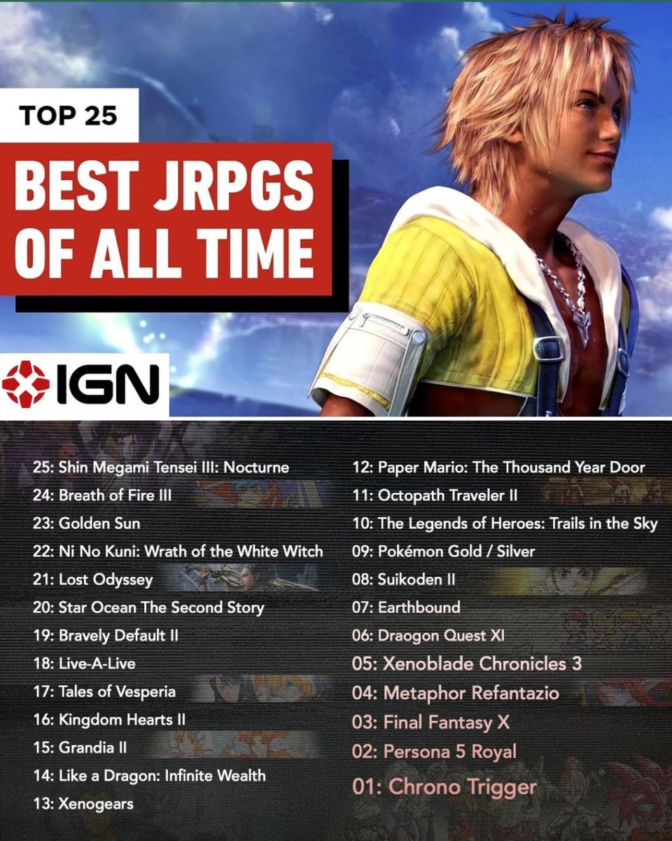 ТОП - 25 лучших JRPG всех времён по-версии IGN: 25. Shin Megami Tensei 3: Nocturne 24. Breath of Fire 3 23. Golden Sun 22. Ni No Kuni: Wrath of the White Witch 21. Lost Odyssey 20. Star Ocean The Second Story 19. Bravely Default 2 18. Live A Live 17: Tales of Vesperia 16. Kingdom Hearts 2 15. Grandia 2 14. Like a Dragon: Infinite Wealth 13. Xenogears 12. Paper Mario: The Thousand Year Door 11. Octopath Traveler 2 10. The Legends of Heroes: Trails in the Sky 09. Pokémon Gold / Silver 08. Suikoden 2 07. Earthbound 06. Draogon Quest XI: Echoes of an Elusive Age 05. Xenoblade Chronicles 3 04. Metaphor Refantazio 03. Final Fantasy X 02. Persona 5 Royal 01. Chrono Trigger Ну как? согласны со списком ? #DreidUPGaming #JRPG