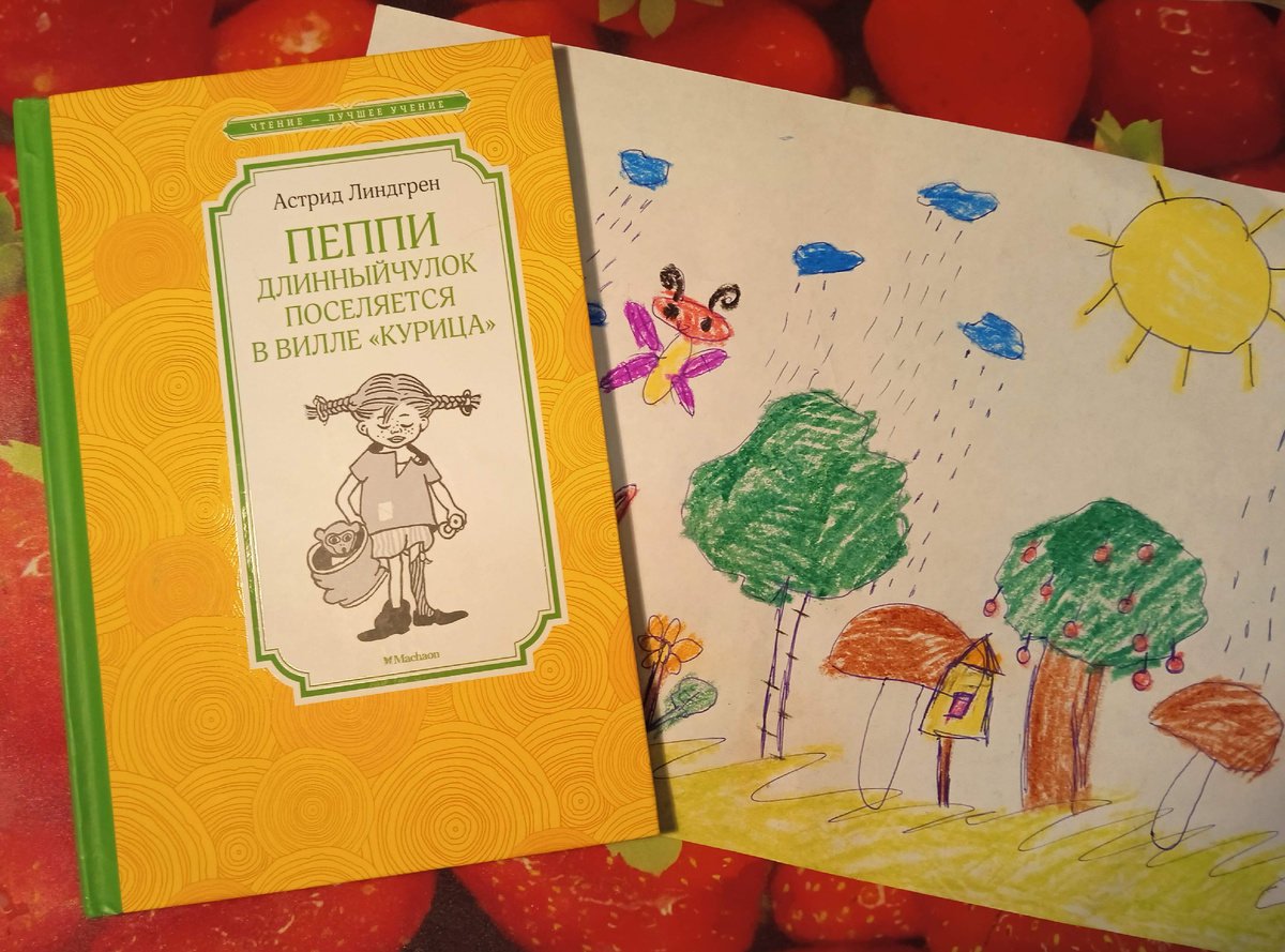 Всем привет! На выходных я читал книгу А. Линдгрен "Пеппи Длинныйчулок поселяется в вилле "Курица" и сейчас о ней расскажу! Эта книга для меня интересная, в ней происходят разные забавные приключения с главной героиней - Пеппи Длинныйчулок, а также с её друзьями - братом и сестрой Томми и Анникой. В этой книге в начале Пеппи поселяется в своей вилле под названием "Курица", а потом уже она знакомится с благовоспитанными соседскими ребятами - Томми и Анникой. Вместе они очень весело проводят время. Пеппи всегда находит, чем ей с друзьями заняться! У неё есть большой комод с разными сокровищами - сувенирами из путешествий, и она с удовольствием дарит ребятам какие-нибудь вещи на память. Но в обычной жизни и в школе Пеппи пока не очень хорошо всё понимает, особенно как себя вести - например, если тебя пригласили в гости. И это неудивительно, ведь она живёт без родителей, а только с обезьянкой, которую зовут господин Нильсон, и с лошадью. Её мамы не стало рано - когда Пеппи была в коляске и