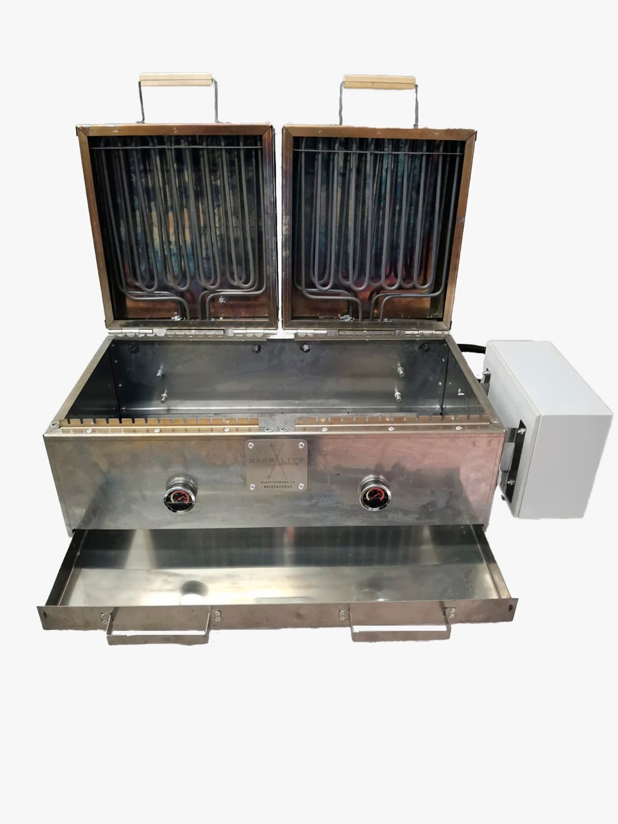 Электрический мангал МЭП-02 с ТЭНами сверху характеристики: Рабочая длина 700 мм; Общая длина 900 мм; Рабочая ширина 340 мм; Общая ширина 500 мм; Высота 350 мм; Количество пазов для шампуров 30 шт; Количество ТЭНов 4 шт; Количество секций 2 шт; Рабочее напряжение 220/380 В; Максимальная мощность 12 кВт; Минимальная мощность 3 кВт; Способ подключения: через автоматический выключатель; Цвет черный/серебристый; Количество легкосъёмных герметичных поддонов 1 шт; Время разогрева до рабочей температуры 4-5 минут. Мангал МЭП-02 с ТЭНами сверху подойдёт для торговой точки со средней проходимостью, кафе или ресторана. Основное преимущество этого мангала это отсутствие необходимости иметь особые навыки приготовления шашлыка, так как весь технологический процесс основан на временном диапазоне жарки. Две работающих независимо друг от друга секции и длина 700 мм., этого мангала являются преимуществом в торговой точке средней проходимости. Мангал можно использовать на половину рабочей длины, при от