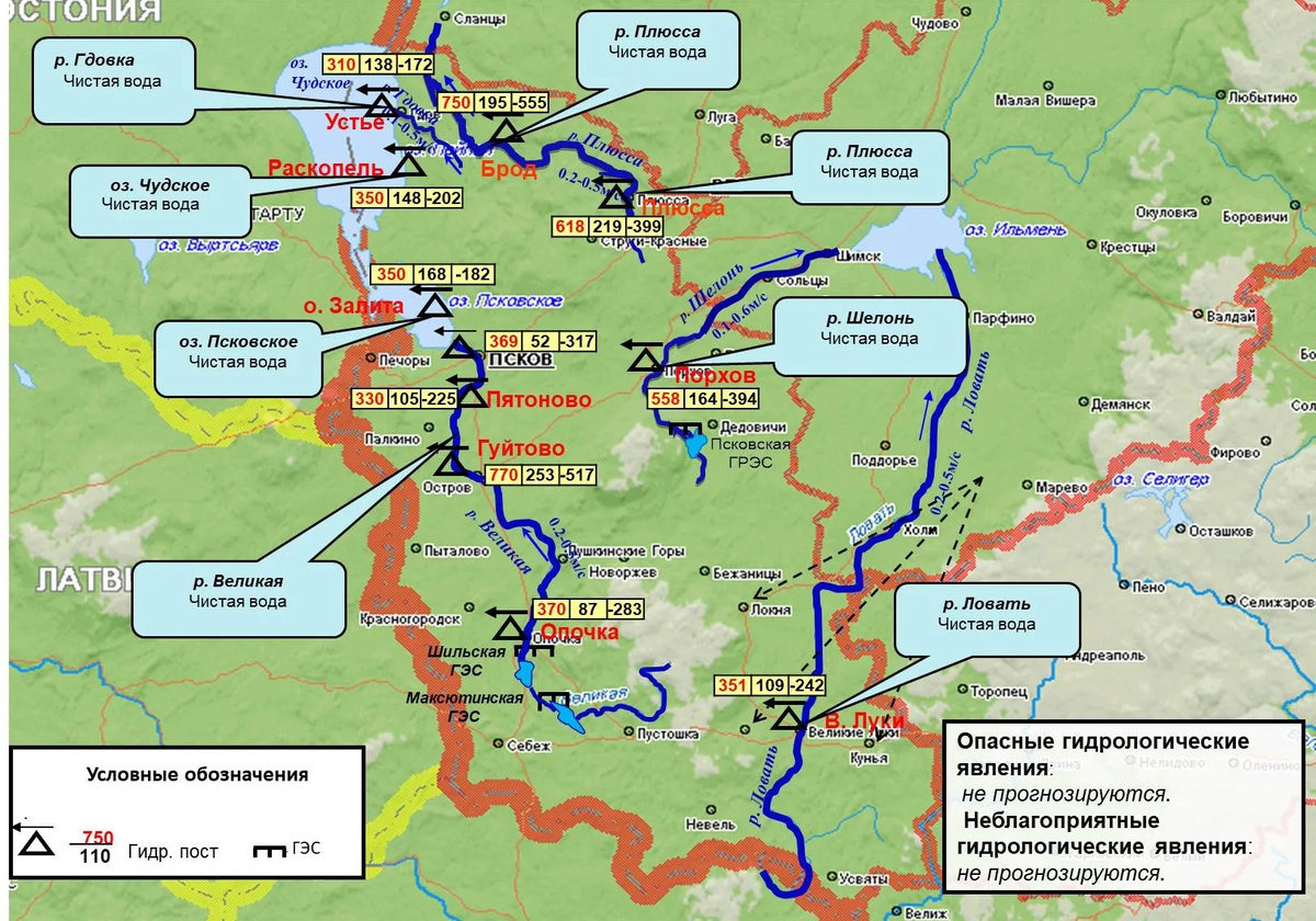На территории Псковской области более 3700 озер, самым крупным из которых является Псковско-Чудское озеро, занимающее по величине четвертое место в Европе. Самыми крупными реками являются Великая, Ловать, Шелонь и Плюсса. Исток реки Великой находится на Бежаницкой возвышенности Псковской области, устье в Псковском озере. Длина реки 430 км. Исток реки Ловать находится в Витебской области Беларуси, устье – в озере Ильмень Новгородской области. Длина реки Ловать в границах Псковской области составляет 250 километров. Исток реки Плюсса находится около посёлка Заплюсье Псковской области, устье – в Нарвском водохранилище недалеко от города Сланцы Ленинградской области. Длина реки Плюсса в границах Псковской области составляет 247 километров. Исток реки Шелонь находится недалеко от посёлка Дедовичи Псковской области, устье - в озере Ильмень Новгородской области. Длина реки Шелонь в границах Псковской области составляет 171 километров.