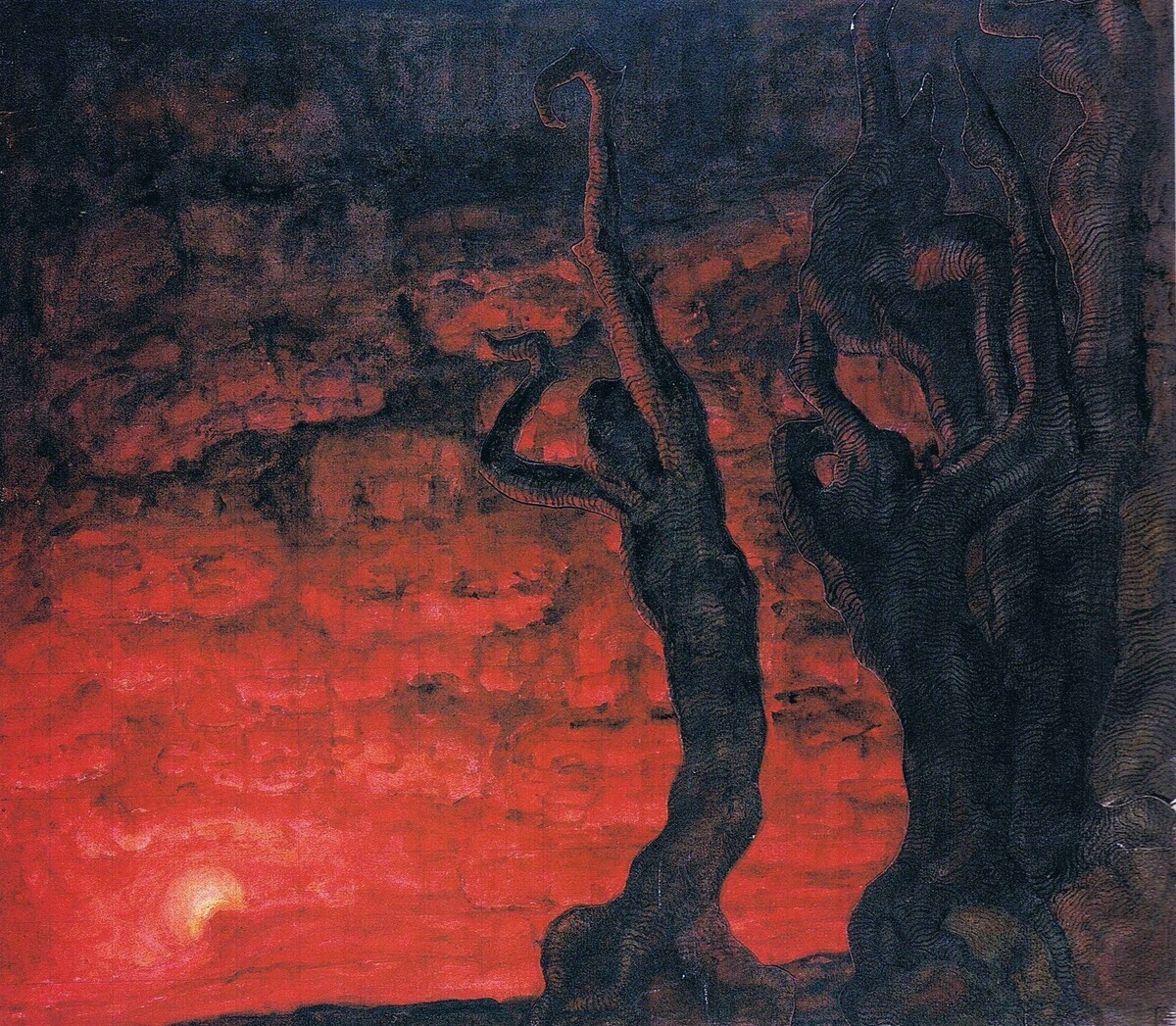 Однажды к нему пришел критик, щеголяющий цилиндром и презрением. Увидев «Лилит с Двенадцатью Чревами», он закричал, вырвал себе глаза стеклом от разбитых очков. Калмаков лишь усмехнулся, собирая кровавые капли в склянку — новый пигмент для апокалиптического заката.