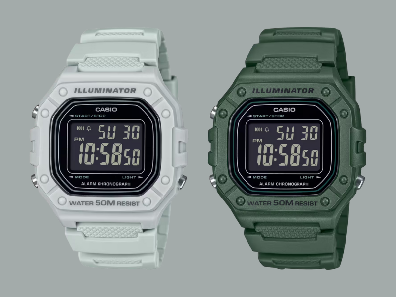 На международном веб-сайте Casio были анонсированы модели часов W-218H-3BV и W-218H-8BV. Новинки позиционируются как обладающие "спортивным цифровым дизайном" и имеют габариты 44,4 x 43,2 x 10,8 мм. Новинки Casio, модели W-218H-3BV и W-218H-8BV, сохраняют функциональность предыдущих моделей серии W-218H. В частности, обеспечивается водонепроницаемость до 50 метров и заявленный срок службы батареи CR2016 до семи лет. В набор инструментов входят секундомер с шагом 1/100 секунды и ежедневный будильник. Предусмотрена возможность выбора между 12- и 24-часовым форматами отображения времени, при этом заявленная точность хода составляет ±30 секунд в месяц. Календарь является полностью автоматическим, с фиксированным значением февраля в 28 дней, а янтарная светодиодная подсветка облегчает считывание информации с цифрового дисплея в условиях недостаточного освещения. Модель W-218H-3BV выполнена в темно-зеленом цвете из смолы, а W-218H-8BV – в более светлом, мятно-зеленом, обе версии имеют темный