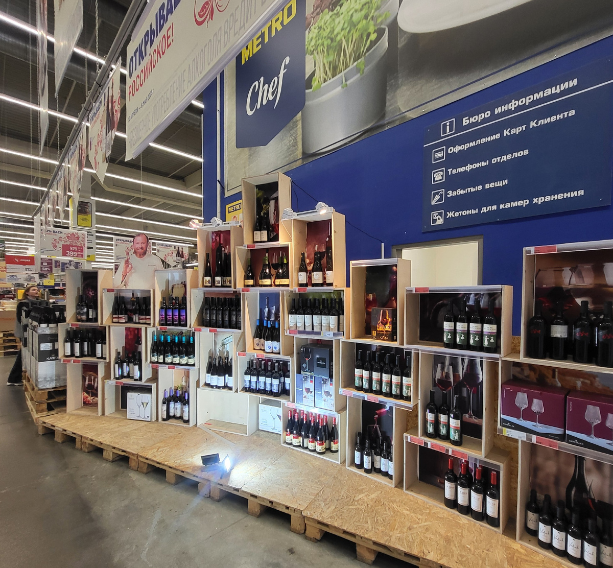 С 4-го апреля в торговых центрах METRO проходит акция «Дни российских вин». Согласно данным из различных информационных источников, акция проходила до 6 мая, а вот если верить информации на официальном сайте МЕТРО - до 31 мая. Думаю следует верить официальному источнику. Если это не так, пишите в комментариях. Я был в МЕТРО накануне майских праздников и планирую до конца месяца заехать ещё раз, вполне возможно что-то из того, что меня заинтересовало, ещё будет в наличии. Из 299 позиций российского вина, представленных на полках МЕТРО, на 54 позиции в рамках проводимой акции установлены скидки от 30% до 50%. Есть действительно привлекательные цены, но есть и совершенно непонятные. Часть вин выставлена сразу при входе на специально оборудованном стенде. Некоторые ячейки уже пустые. В них выставлены только некоторые вина, но представление о ценах составить можно. Но торопиться и хватать что-то с этих полок не надо. Лучше пройти чуть дальше. По залу также периодически расставлены палле