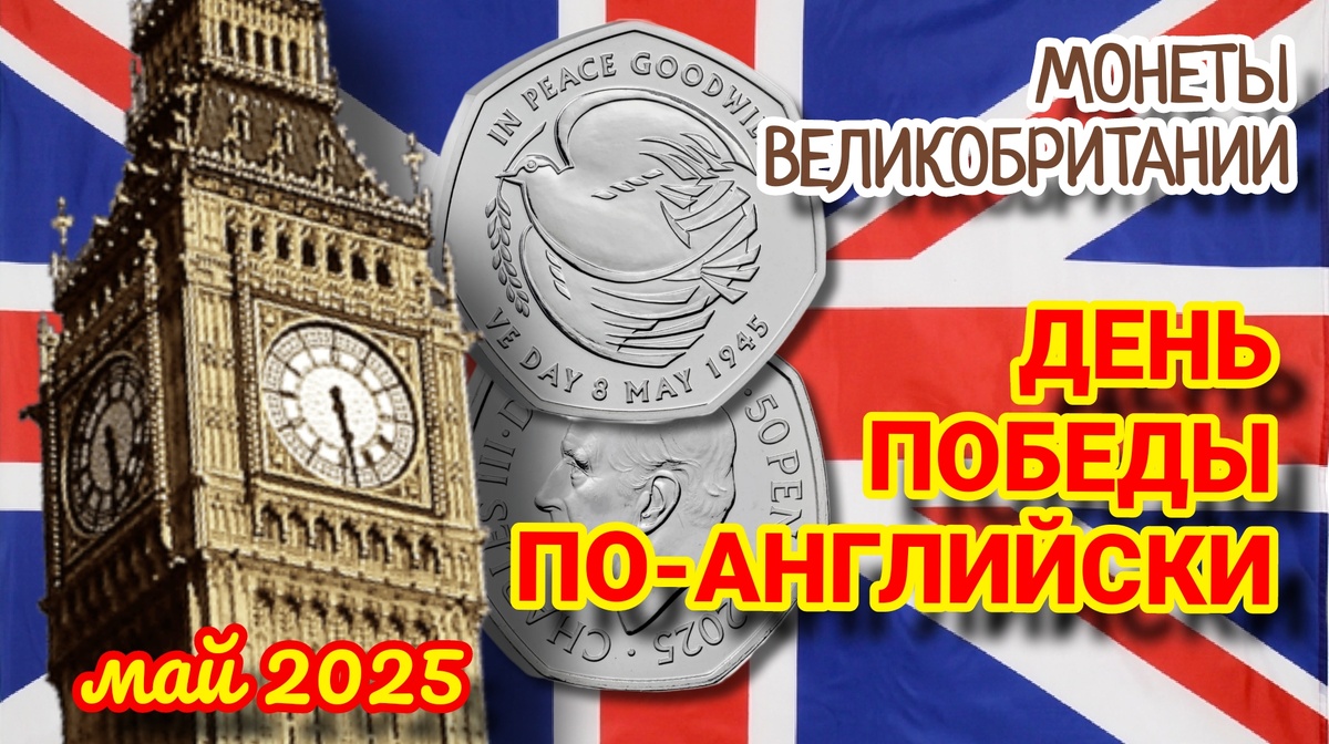 Победа над фашизмом во Второй мировой войне - не только наш праздник. Об этом важном историческом событии помнят во всём мире. В том числе, ещё пока помнят и наши бывшие союзники - США, Великобритания, Франция, Канада. Для них это ещё пока тоже праздник. Хотя, почему «ещё пока»? Возможно, что наоборот, с каждым годом праздник Победы в этих странах будет становиться всё более значимым. Почему бы и нет? Ведь именно эти страны - победители фашизма и освободители Европы! А мы что? Мы так... мимо проходили. Ну, да ладно. Будем надеяться, что время всё расставит на свои места. Переходим ближе к теме. 8 мая в Великобритании отмечается День Победы в Европе (Victory in Europe Day или сокращённо - VE Day). И к 80-летию Победы в Европе Банк Англии выпустил 4 памятных монеты - 1 золотую, 2 серебрянных и одну медно-никелевую. Дизайн у всех монет идентичный. Не будем рассматривать драгоценные монеты. Посмотрим лишь на недрагоценную. Монета вышла в обращение в канун праздника 7 мая 2025 года. Ска