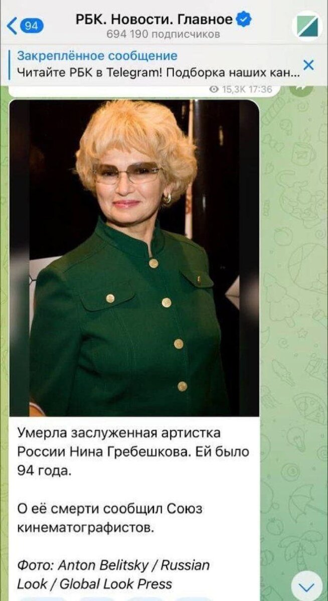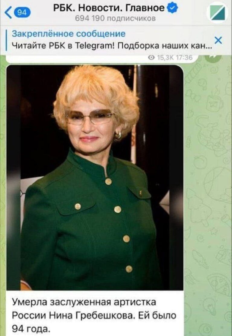 Сегодня, 12 мая, стало вдруг известно о кончине статусной уроженки Брянска, вдовы питерского мэра и матери медиамагната Ксении Собчак, бывшего сенатора Людмилы Нарусовой. Новость успела опечалить многих (хотя кому-то дала повод и для злорадства). Но она оказалась пустышкой. Федеральное новостное издание РБК неожиданно похоронило одну из самых известных уроженок Брянска Людмилу Нарусову. Вдову первого мэра Ленинграда (нынешнего Санкт-Петербурга) Анатолия Собчака и мать теледивы Ксении Собчак, а также бывшего сенатора от Брянской области (давно) и затем Тувы. Печальное известие с фото Нарусовой опубликовал вечером 12 мая официальный телеграм-канал РБК. примечателен его слоган, закрепленный в “шапке”, он такой: “Самые важные новости, только проверенная информация”… Правда, в тексте самой новости говорилось о кончине совсем другого известного человека: “Умерла заслуженная артистка России Нина Гребешкова. Ей было 94 года. О смерти вдовы Леонида Гайдая сообщил Союз кинематографистов”. Людмил