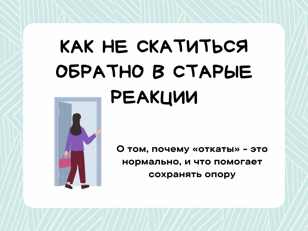 Попробуйте сформулировать: – Как выглядит мой “откат”? – Какие фразы, привычки, телесные ощущения его сопровождают? – Что мне может помочь в этот момент?