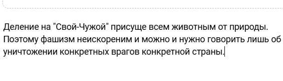 Деление на "Свой-Чужой" присуще всем животным от природы. Поэтому фашизм неискореним и можно и нужно говорить лишь об уничтожении конкретных врагов конкретной страны.