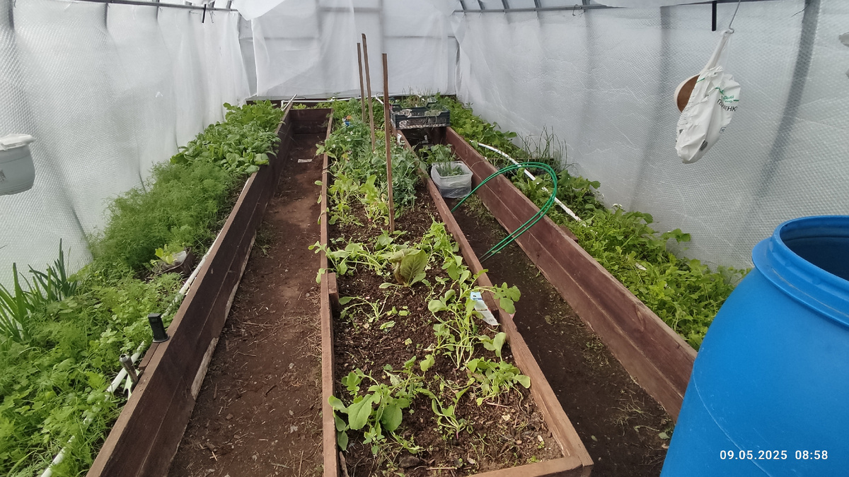 Продолжаю всех расселять. Сил и надежды ждать хорошую погоду уже нет, поэтому повесили и во вторую теплицу обогреватель. Не знаю во что это обойдётся, но или так, или снова пересадки. На них уйдёт больше времени, сил и денег. Грунт то покупать приходится, огородный - песок со свойствами цемента 😄 В общем решили - сделали. Теперь надо же место для перцев освободить. По центру грядки высажен горох рассадный, который мы подъедаем потихоньку. Мало посадила, надо было побольше. Поставила колышки для сетки И прилепила сетку На неё подвязала горох почти без проблем Почти, потому что этот усатый товарищ цеплялся за всё подряд. Зелень, которая бушевала на грядке, уже мешала. Съесть столько мы уже не в силах, поэтому было два варианта - в компост или курам. Раньше соседям раздавала, теперь у них и у самих всё растёт, научила на свою голову 😄 И тут пришёл в голову третий вариант - попробовать продать за символическую плату. Выложила в местной группе - тишина, в городской - тоже, а вот когда в
