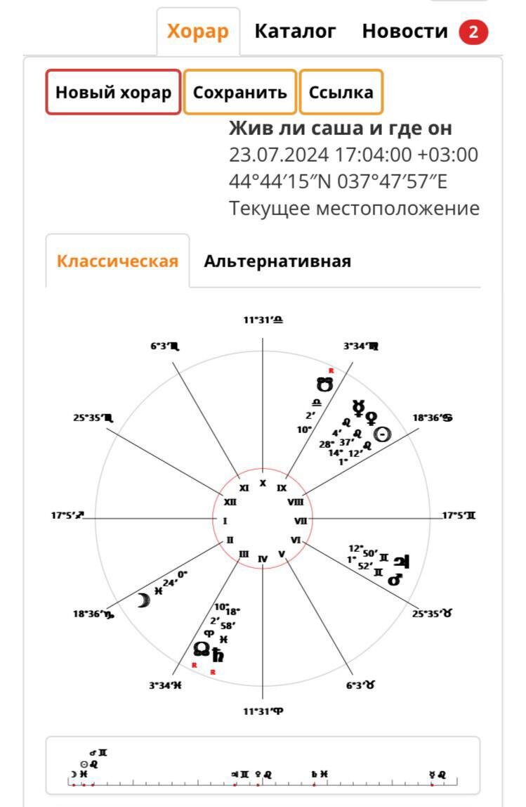 Ситуация произошла летом 2024 с моим близким человеком. Вопрос к небесам: «Жив ли и где он?». Карта вот: Управитель 7 дома Меркурий в 8 доме. Можно было подумать, что человек умер. Однако Меркурий находился в соединении со звездой Регул, что говорит о благоприятном исходе и Меркурий движется в свою обитель, что указывает на улучшение дел. Знаете, как отыгрался хорар? Человек оказался жив и без сознания в больнице. Прохожие вызвали скорую. А узнали мы об этом в тот день, когда Меркурий менял знак. Итого: 8 дом показывал отсутствие сознания, а Регул отрицал смерть. Вот такой интересный исход получился. По ссылке смотрите поиск ребенка с помощью таро и астрологии. Пусть все найдутся живыми и невредимыми. Хорошего дня! С уважением, Виола Скарабеева. #гороскоп