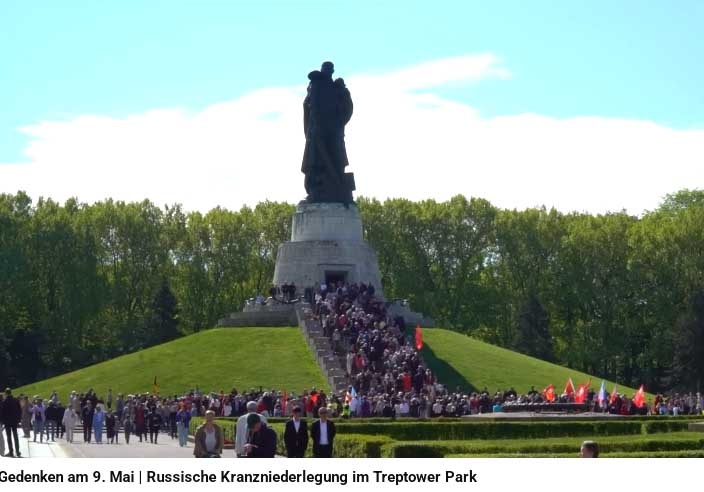 В Берлине на территории Бессмертного Полка была запрещена символика СССР, это флаг Победы, военная форма СССР, Георгиевская лента, военные песни. Так вот, устроители придумали новый символ, это "Синий платочек". Журналист спросил, а если и его запретят? Она ответила, что обязательно придумают новый символ. А вот берлинец, немец, пронес на территорию Трептов-парка красное знамя. Если бы это был русский, его бы не пропустили, но это был немец. А я, говорит он, хитрый, это просто кусок красной материи без всяких символо: Как обходить запрет Георгиевской ленточки, показали девушки с надписью на футболках: "Георгиевская лента запрещена в Германии". На самом деле она у них под футболкой, но она есть: Хотя запреты действовали в основном на территории Бессмертного полка для просто граждан, а официальным делегациям можно было и ленту и форму: Надо сказать, что только в Берлине были слишком строгие запреты. А Кёльнцы, например, подали в суд и выиграли привилегию носить и ленточки и форму: Переда