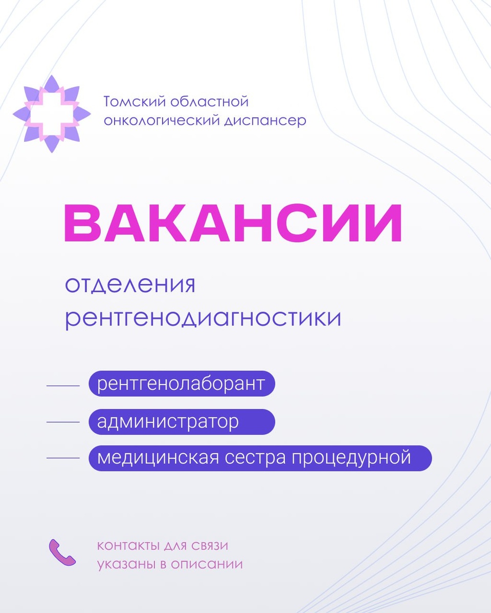 Приглашаем стать частью передовой медицины. В Томский онкологический диспансер требуются специалисты в отделение рентгенодиагностики: 1. Администратор — Работа будет осуществляться по адресам: пр. Ленина, 115, Ивана Черных, 96 стр. 16. — Заработная плата: от 41 000 руб. — По вопросам обращаться к начальнику отдела кадров Томского онкологического диспансера Сизиковой Юлии Вячеславовне в рабочее время: 8-923-402-05-45 2. Рентгенолаборант — Работа будет осуществляться по адресам: пр. Ленина, 115, Ивана Черных, 96 стр. 16. — Заработная плата: от 75 000 руб. — По вопросам обращаться к начальнику отдела кадров Томского онкологического диспансера Сизиковой Юлии Вячеславовне в рабочее время: 8-923-402-05-45 3. Медицинская сестра процедурной — Работа будет осуществляться по адресам: пр. Ленина, 115, Ивана Черных, 98Б. — Заработная плата: от 58 000 руб. — По вопросам обращаться к начальнику отдела кадров Томского онкологического диспансера Сизиковой Юлии Вячеславовне в рабочее время: 8-