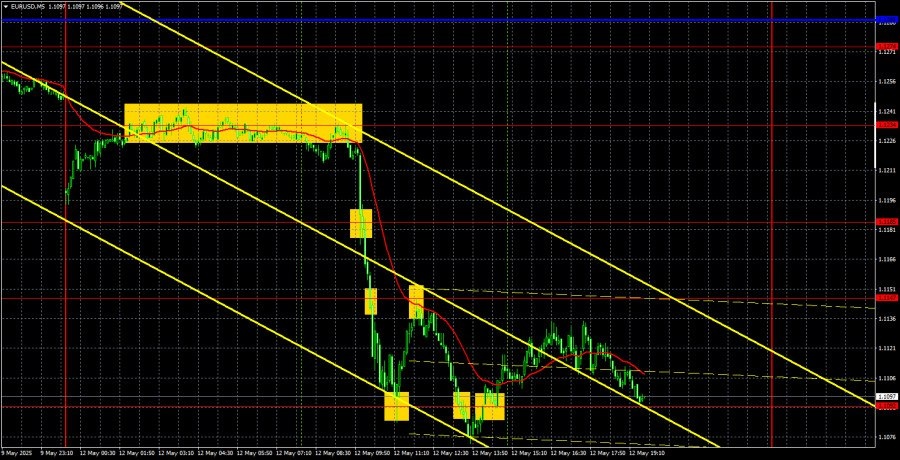 https://basechop.ru/wordpress/?p=42370 Анализ EUR/USD 5M. Валютная пара EUR/USD в течение понедельника показала сильное нисходящее движение, чего с ней уже давно не случалось. Правда, причины резкого и неожиданного роста американской валюты, что называется, лежат на поверхности. Китай и США внезапно, на первой же консультации договорились о снижении взаимных тарифов на 115%. То есть на абсолютно большую часть. Таким образом, остались только 30% со стороны США и 10% со стороны Китая. Похоже, что такие цифры устроили обе стороны, а рынок выдохнул с облегчением. Напомним, что тарифы 145%-125%, по сути, означали, что торговля между государствами прекращена. Поэтому было очевидно, что рано или поздно стороны договорятся, ибо никому не выгодна торговая война. Китай никогда не отрицал свою готовность к переговорам, а в Америке ждали, когда Пекин первым выйдет на связь. В итоге встреча состоялась в Швейцарии и прошла мега-продуктивно. Доллар же отреагировал бурным ростом. И это то, о чем мы…