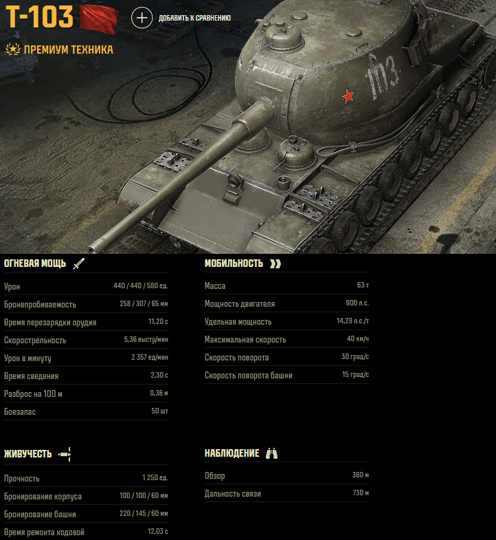 1) Премиум ПТ СССР T-103. Данная машина максимально универсальна и проста в понимании, ибо это ПТ с полноценной башней, наличием какой-никакой брони и пушкой с разовым уроном в 440 и отличным пробитием базовым снарядом. Крайне близка к ТТ стилю игры. Но главная особенность - стоимость одного снаряда с её разовым уроном - 910 серебра. Ещё раз, при альфе в 440 это очень дешево за 1 выстрел, что в купе с её пробитием в 258мм - великолепная экономия на снарядах. Актуальные ТТХ на скрине ниже.