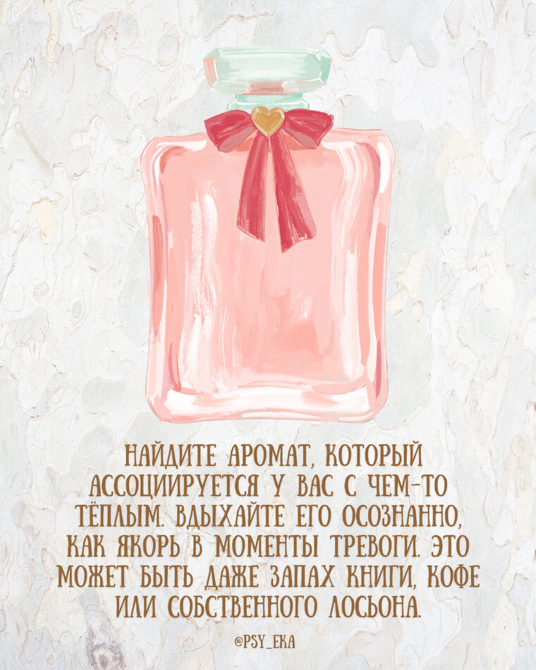 💡 Упражнение: найдите аромат, который ассоциируется у вас с чем-то тёплым. Вдыхайте его осознанно, как якорь в моменты тревоги. Это может быть даже запах книги, кофе или собственного лосьона. 2️⃣Внутреннее кино
