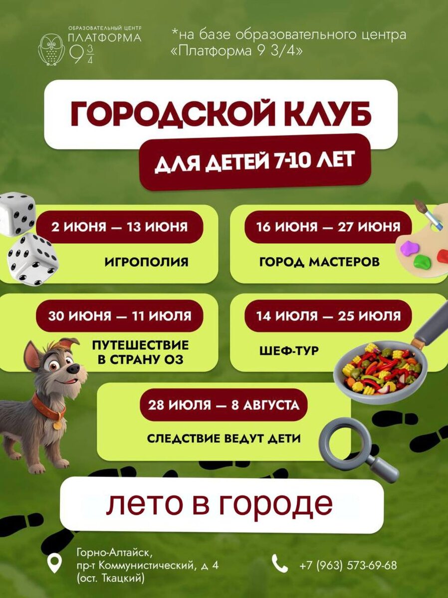 Лето в городе или Чем заняться детям на каникулах 👇🏼 1️⃣ Городской клуб -досуговая программа для детей 7-10 лет, где открывается новый мир: кулинарные приключения, творческие мастерские, детективные расследования и даже продакшн настоящего видеоконтента! 📌Тематики программ: 🐞2 июня - 13 июня — "Игрополия" (игры, командные квесты, веселые испытания) 🐞16 июня - 27 июня — "Город мастеров" (погружение в мир профессий: дети попробуют себя в роли строителя, врача, дизайнера, шеф-повара и многих других) 🐞30 июня - 11 июля — "Путешествие в страну ОЗ" (сказочные приключения, квесты, волшебные истории) 🐞14 июля - 25 июля — "Шеф-тур" (экскурсии в кафе и пекарню, знакомство с профессией, изучение иностранных слов) 🐞28 июля - 8 августа — "Следствие ведут дети" (детективные игры, расследования, поиск улик) 2️⃣ Школа блогеров - -для тех, кто хочет освоить съемку и монтаж, научиться уверенно говорить на камеру и создать свой контент-проект. (8-12 лет) Даты школы: с 14 по 25 июля ❗️С