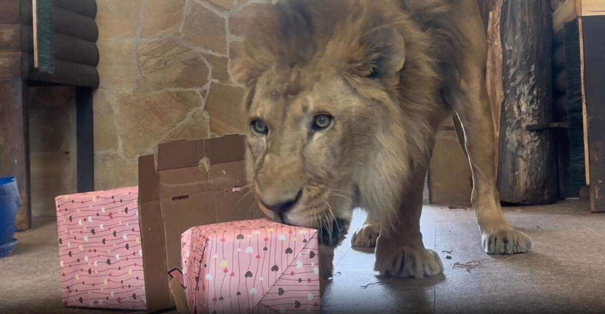 В Ленинградском зоопарке показали, как лев Адам распаковал подарки на день рождения