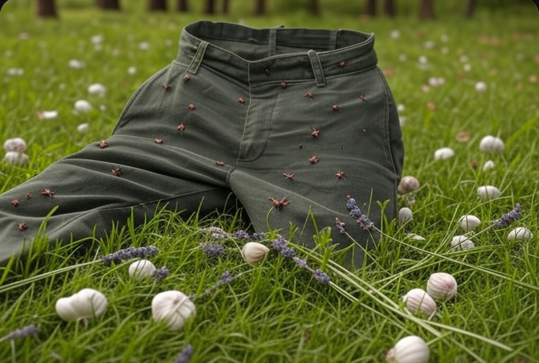 Чтобы усилить защиту, обработайте верхнюю часть штанов (выше липкой ленты) натуральным репеллентом. Клещи не любят запахи некоторых растений, таких как лаванда, мята или чеснок. Сделайте настой: измельчите 2-3 зубчика чеснока, залейте их 0,5 литра воды, дайте настояться ночь, а затем добавьте 10 капель эфирного масла мяты или лаванды. Перелейте смесь в пульверизатор и опрыскайте штаны. Это отпугнёт клещей, которые всё же попытаются подняться выше.