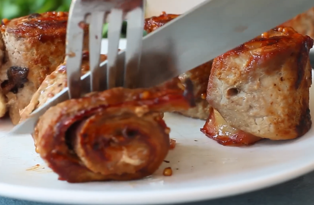 Смешайте в миске соевый соус, горчицу и сладкий соус чили. Этой смесью смажьте обёрнутое мясо со всех сторон. Посолите и поперчите по вкусу. 5. Обжарьте или запеките.