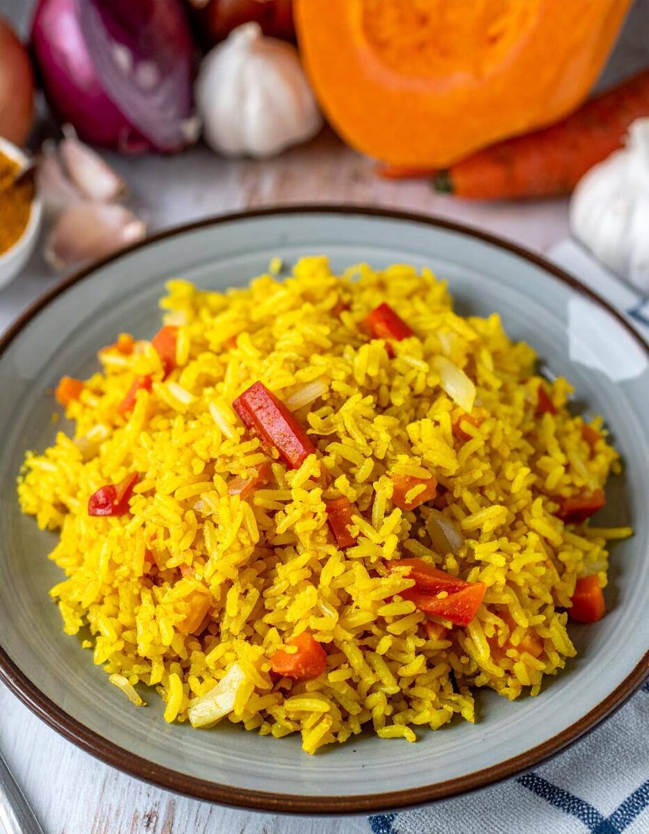 Этот простой злак кормит половину планеты! И не только потому, что он дешёвый. Белый, бурый, жасминовый, басмати, дикий — рис поражает разнообразием вкусов и текстур. Он идеально впитывает соусы, специи и ароматы и подходит для тысяч рецептов. Польза, правда, сосредоточена прежде всего в буром — там больше клетчатки, витаминов группы B и минералов, чем в шлифованном белом. Но и его можно сделать здоровее - если сначала охладить после варки, а потом снова подогреть, крахмал перейдет в вариант с меньшим гликемическим индексом - резистентный. Порция варёного риса — это около 130 ккал и источник медленных углеводов, которые дают длительное ощущение сытости. Рис прекрасно подходит и для горячих блюд, и для салатов, и даже для десертов. Если ищете простую, полезную идею — попробуйте приготовить рис с овощами и куркумой. Ингредиенты (на 2 порции): - рис — 150 г - морковь — 1 шт. - сладкий перец — 1 шт. - лук — 1 небольшая головка - чеснок — 1 зубчик - куркума — 0,5 ч. л. - оливковое масло — 1