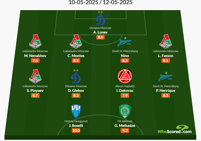 По два игрока вошли в команду недели из "Динамо" и "Зенита". По одному футболисту представляют "Акрон", "Пари НН" и "Ахмат". Лучшим игроком тура стал форвард "Пари НН" Хуан Боселли, который забил 4 гола в победном матче против "Крылев Советов" (5:2). Его игра оценена в 10 баллов.