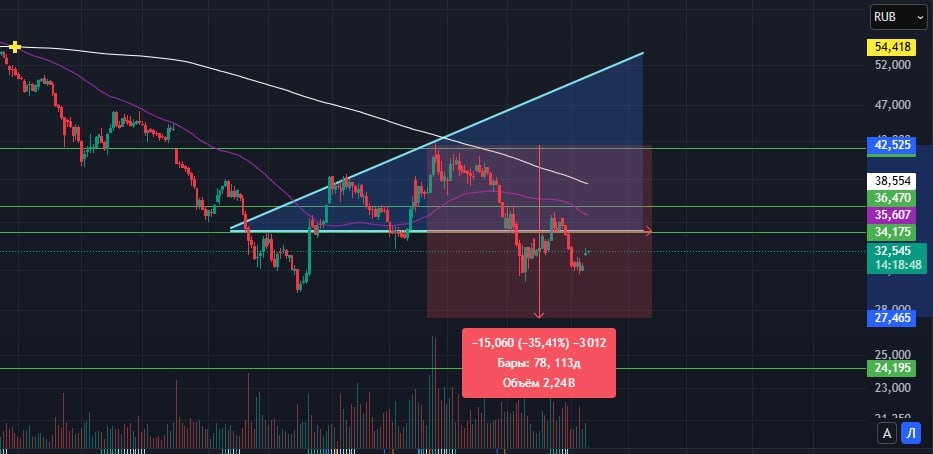 $MAGN 🤓Ситуации по этому активу неоднозначные. 🕯Построил поджатие к уровню поддержки 33, 62, пошёл отрабатывать но пока что не хватает объёмов пойти вниз, очень хочет построить разворотную фигуру, чтобы сломать треугольник. 🔽Отработка треугольника примерно до 26,58, Но если сейчас построит двойное Дно, то развернётся и пойдёт на повышение. ✔️Подтверждением фигуры двойное дно будет пробитие уровня сопротивления 35,450. 👀Я бы заходить здесь в лонговую позицию не стала, опасно. НЕ ИИР #акции #теханализ #трейдер #инвестиции