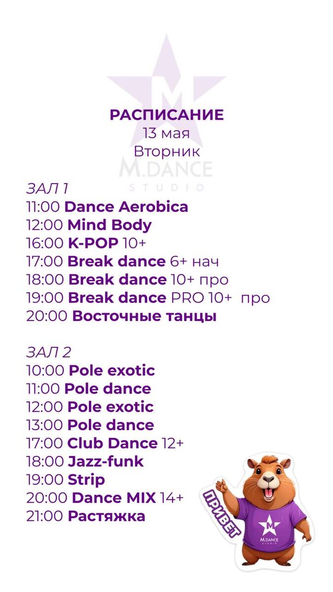 Ждём вас танцевать!💜 ✅ Записаться в WhatsApp ✅ Записаться в Telegram ✅ Группа в ВК ✅ Канал в Telegram ✅ Наш сайт 💌Наше полное расписание https://m-odintsovo.ru/raspisanie/ 📍ул. Маршала Жукова 32 Мы на Яндекс Картах Запись по телефонам: 📲 +79955003021 ☎️ +74994040321 Обсудить, задать вопрос, или внести предложение можно в нашем 👉🏻 чат