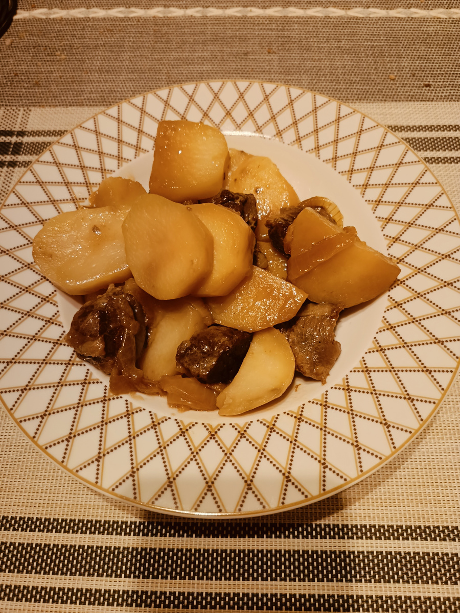 Здравствуйте читатели моего канала и добро пожаловать ко мне на кухню. В один из дней, на майские праздники, вместе с детьми и внуками собрались за одним столом на семейный ужин. Тепло, душевно пообщались, насладились вкусной едой. Обсудили последние новости, поделились своими мыслями и чувствами. Помимо салатов, закусок, десерта, в качестве основного блюда приготовили жаркое по – татарски. Это то, что особенно нравится всем членам семьи. Жаркое из говядины с картошкой знакомо многим. Сытно, вкусно, просто готовится. Думаю, это хороший выбор для семейного ужина. Ниже смотрите рецепт на 2-3 порции. Ингредиенты: Как приготовить: смотрите галерею 1. Очищенный лук нарезаем кольцами толщиной примерно по 1 см. Так чтобы смотрелся красиво и аппетитно. На хорошо разогретую сковороду выкладываем топленое масло, доводим его до жидкой консистенции, сверху укладываем нарезанный лук. Обжариваем его с двух сторон на среднем огне, до появления подпалин, затем убираем на технологическую тарелку. 2. Ка