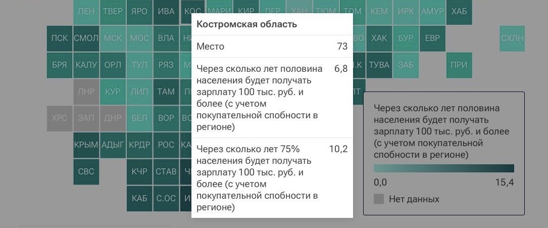 Эксперты проанализировали темпы увеличения зарплат по всей стране с учетом официальной статистики. Выяснилось, что 75% костромичей смогут получать зарплату не ниже ста тысяч рублей только через десять лет. А половина населения достигнет такого заработка почти через семь лет. Костромская область заняла 73-е место в топе регионов России по динамике зарплат.