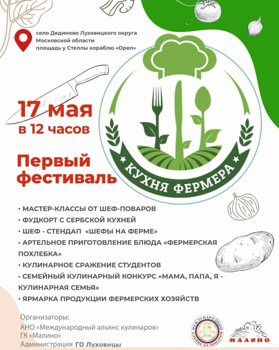 🔥Фестиваль «Кухня фермера» в селе Дединово! Фестиваль уже на этих выходных! Что вас ждет: • шеф-стендап «Шефы на ферме»; • кулинарное сражение среди студентов аграрных колледжей; • семейный кулинарный конкурс «Мама, папа, я — кулинарная семья; • мастер-классы от фермеров и шеф-поваров; • фудкорт с традиционными угощениями и сербской едой; • экспозона с товарами фермерских хозяйств и народными промыслами; • выступление народных коллективов; • круглый стол «Шеф-воркинг». Объединяем фермерство и общепит; • артельное приготовление блюда «Фермерская похлебка» в 200-литровом казане и раздача угощения всем гостям фестиваля. Но кроме всего, вы сможете красиво провести выходные на природе. Свежий воздух, запах костра и природная романтика ждет вас уже в эту субботу. Организаторы фестиваля: АНО «Международный альянс кулинаров» и Школа-интернат село Дединово. Дата: 17 мая, 12.00-17.00 Место: село Дединово Луховицкого округа Московской области. Площадь у стеллы кораблю «Орел».