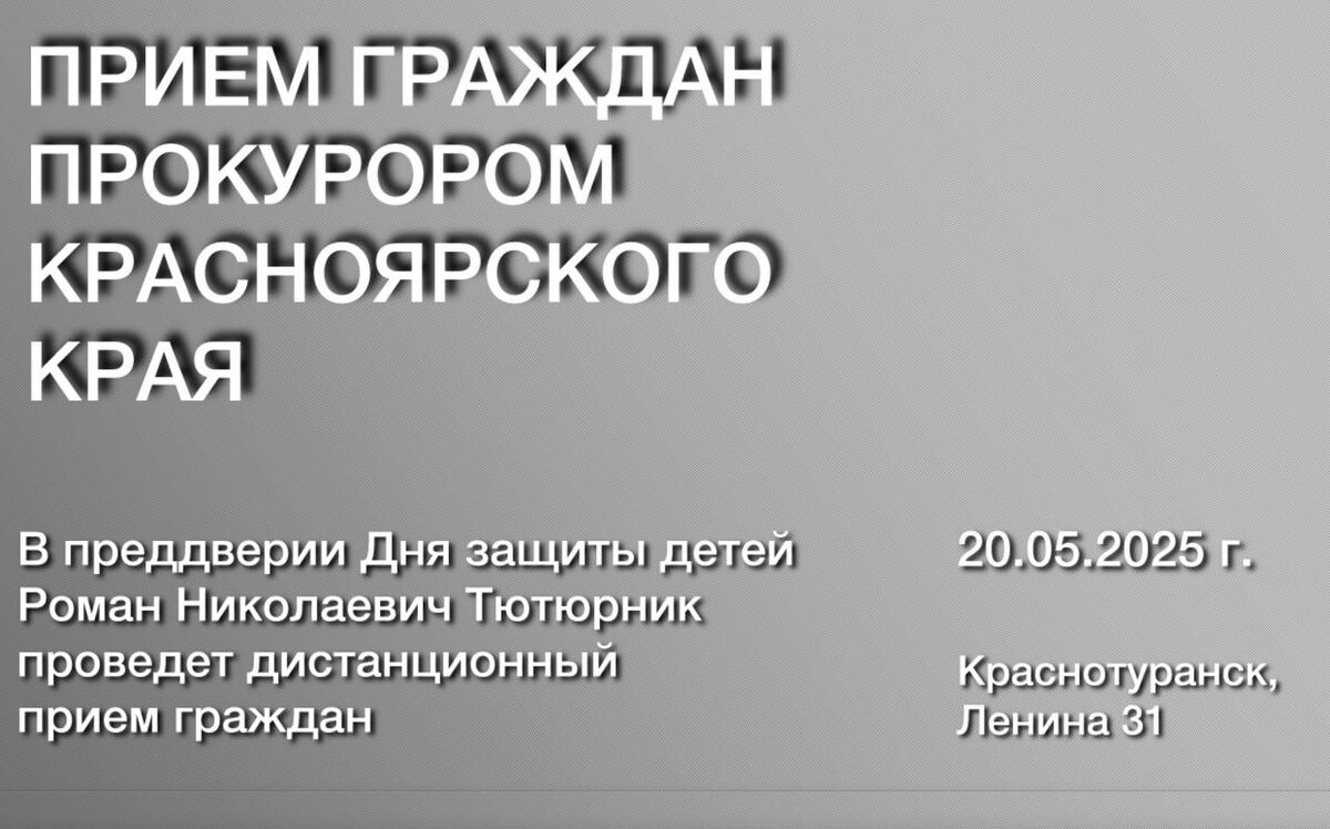🔔Уважаемые жители Краснотуранского района! 20.05.2025 в помещении прокуратуры Краснотуранского района по адресу: с. Краснотуранск, ул. Ленина, д. 31, прокурор Красноярского края Тютюник Р.Н. проведет прием граждан в преддверии Дня защиты детей. Прием будет проведен с использованием видеоконференцсвязи. ✅По вопросам записи на прием необходимо обратиться в прокуратуру района по телефону 8 (39134) 2-15-34 до 14.05.2025. Для наиболее полного и эффективного разрешения вопросов, требующих проверки, гражданам целесообразно иметь на руках заявление с указанием основных доводов, на которые хотели бы получить исчерпывающий ответ». ✅Кроме того, прокурором Краснотуранского района 21.05.2025 с 14 час. до 17 час. будет проведен тематический прием граждан в преддверии Дня защиты детей. #прокуратураКрасноярскогокрая #приемграждан