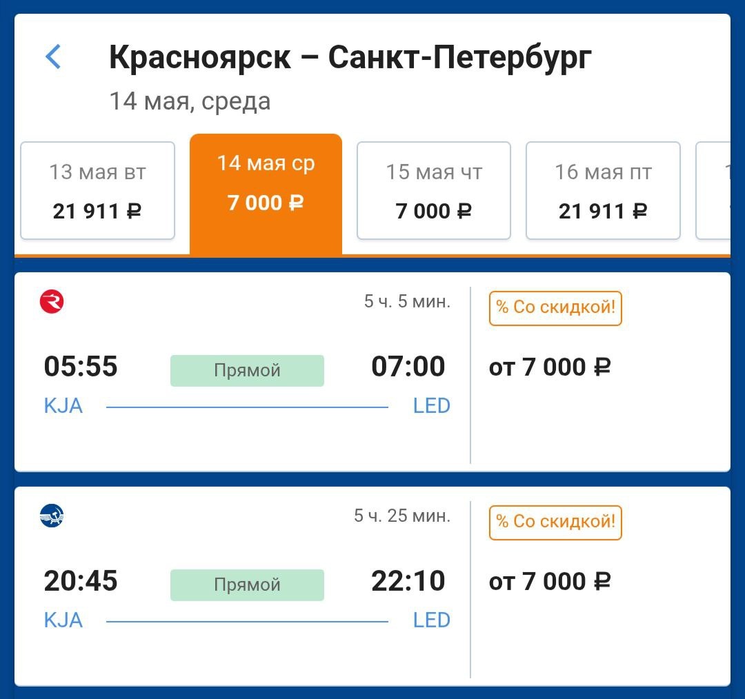 Для лёгких на перелеты у "Аэрофлота" сегодня из Красноярска только Питер с вылетами 14 и 15 мая. Торопитесь, билетов мало! И только на сайте авиакомпании. ❗️Ах, да! Имеется Москва из Красноярска все за те же 13600₽ ↔️ в мае, но даты оооочеень выборочны. @KJA
