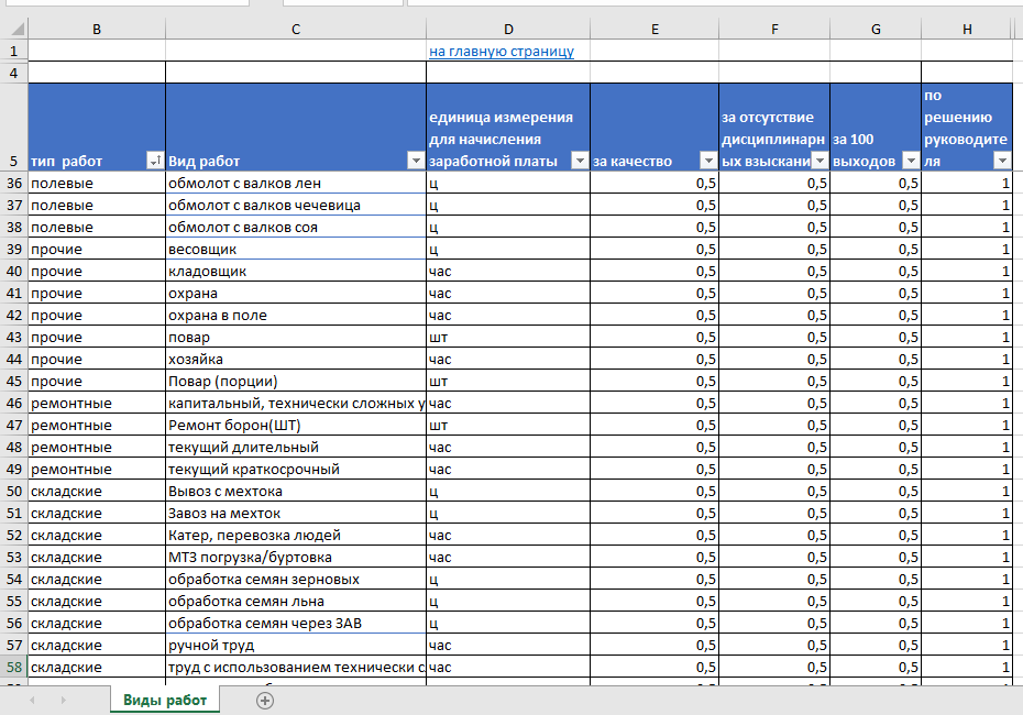 В таблице содержатся данные о всех видах работ, выполняемых сотрудниками предприятия, при этом, виды работ структурированы по типу работ, с целью вывода соответствующего вида работ в рабочие файлы должностных лиц, ответственных за первичный учет труда и выполненных работ на производственных подразделениях, в моем случае - это руководители полевых бригад и зерносклада.