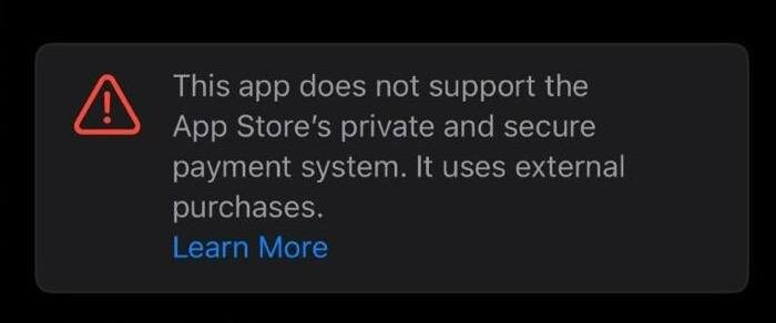 Покупки вне App Store доступны в США и ЕС, но есть нюанс. Apple не слишком довольна этим, и теперь в карточке приложения, а иногда и при его запуске, будет появляться баннер с предупреждением о рисках: «Это приложение не поддерживает безопасную платёжную систему App Store. Оно использует сторонние покупки». Более того, если разработчик выбирает инструмент размещения ссылок для оплаты на внешних сайтах, ему отключают возможность оплаты через Apple. Привыкли оплачивать подписку через Apple Pay? Если разработчик решил сэкономить, вы теряете удобный способ оплаты.