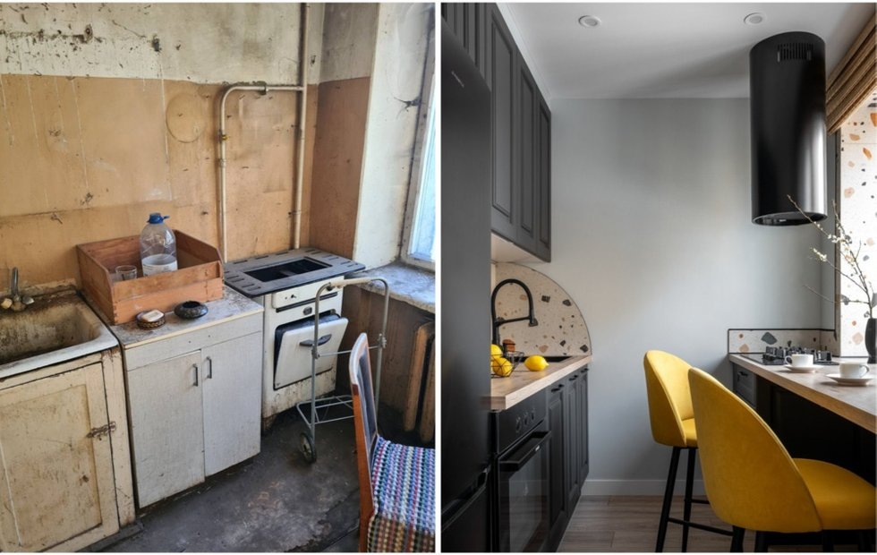 Кухня в хрущевках обычно настолько мала, что в ней едва помещается минимальный набор мебели и техники. Однако дизайнеру удалось найти нестандартное решение.