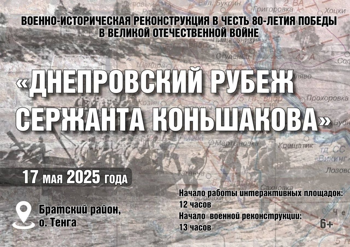 Все братчане 17 мая на Тенгу! Военно-историческая реконструкция впервые пройдет на острове Тенга. Реконструкция «Днепровский рубеж сержанта Коньшакова» восстановит картину подвига земляка гвардии старшего сержанта Андрея Степановича Коньшакова. Он участвовал в боях на Халхин-Голе в 1939 году, в советско-финской войне. С ноября 1941 года воевал на Северо-Западном, Западном, Центральном, Сталинградском, Степном фронтах. Участвовал в контрнаступлении советских войск под Москвой, в Сталинградской битве. Отличился солдат во время битвы за Днепр.