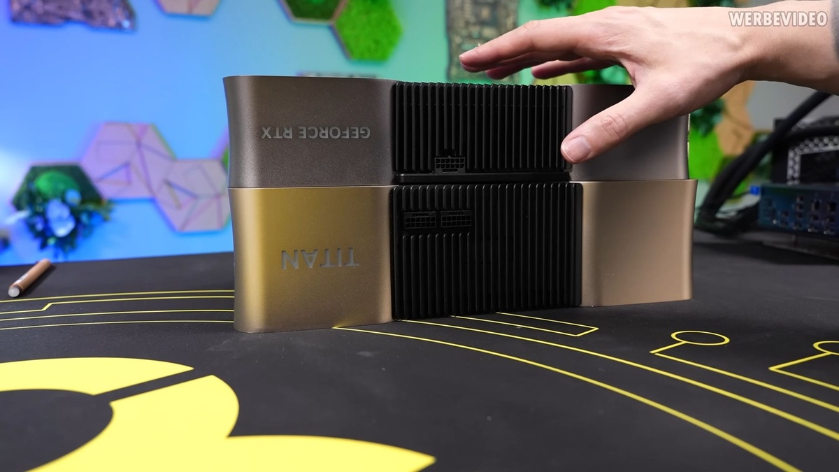 В тестах der8auer, так и не выпущенная видеокарта Nvidia RTX Titan из поколения Ada расположилась ровно между Geforce RTX 4090 и Geforce RTX 5090. В то время как прототип протестированный впервые, показал в среднем на 22 процента лучшие результаты, чем Geforce RTX 4090 в Cyberpunk 2077 в разрешении 4K/UHD (2160p) с максимальной детализацией без трассировки лучей и пути, в 3DMark Time Spy Extreme может набрать на 15 процентов больше баллов. Анализ производительности и энергопотребления в Cyberpunk 2077 показывает, что Geforce RTX Titan потребляет примерно на 17 процентов больше энергии, для увеличения количества кадров в секунду на 22 процента, что делает его более эффективным, чем Geforce RTX 4090. Этот прототип с его сложным 4-слотовым кулером и полностью функциональным графическим процессором AD102 демонстрирует, что этот графический ускоритель изначально был в планах Nvidia. Как сообщает Роман, массивная система охлаждения с четырьмя слотами у Nvidia RTX Titan очень тихая и способна