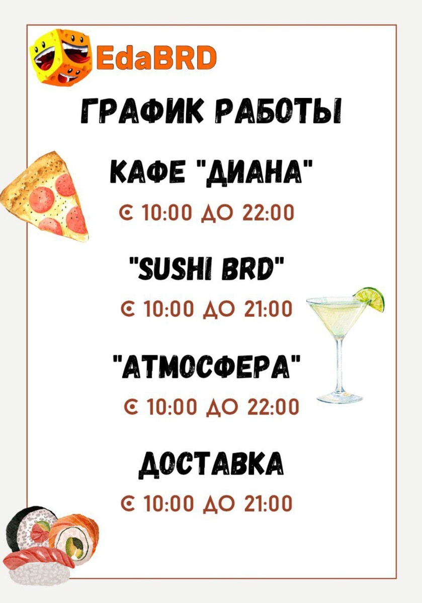 🔸🔸🔸🔸🔸🔸🔸🔸 🤩🤩🤩🤩🤩🤩🤩🤩 С завтрашнего дня меняется график работы🗓 🕚Кафе "Диана" ул. Кирова (Европейская), 54–Б 🔜С 10:00 до 22:00 🕙Кафе "SushiBRD" ул. Дюмина (Итальянская), 50–В 🔜С 10:00 до 21:00 🕖Кафе - бар "Атмосфера" пр.Восточный (Пролетарский), 157 🔜С 10:00 до 22:00 🕤Доставка 🔜С 10:00 до 21:00 +7-990-216-64-58 (+7Телеком) +7-990-183-65-87 (Миртелеком) МЫ ЖДЁМ ВАС В ГОСТИ 🤍