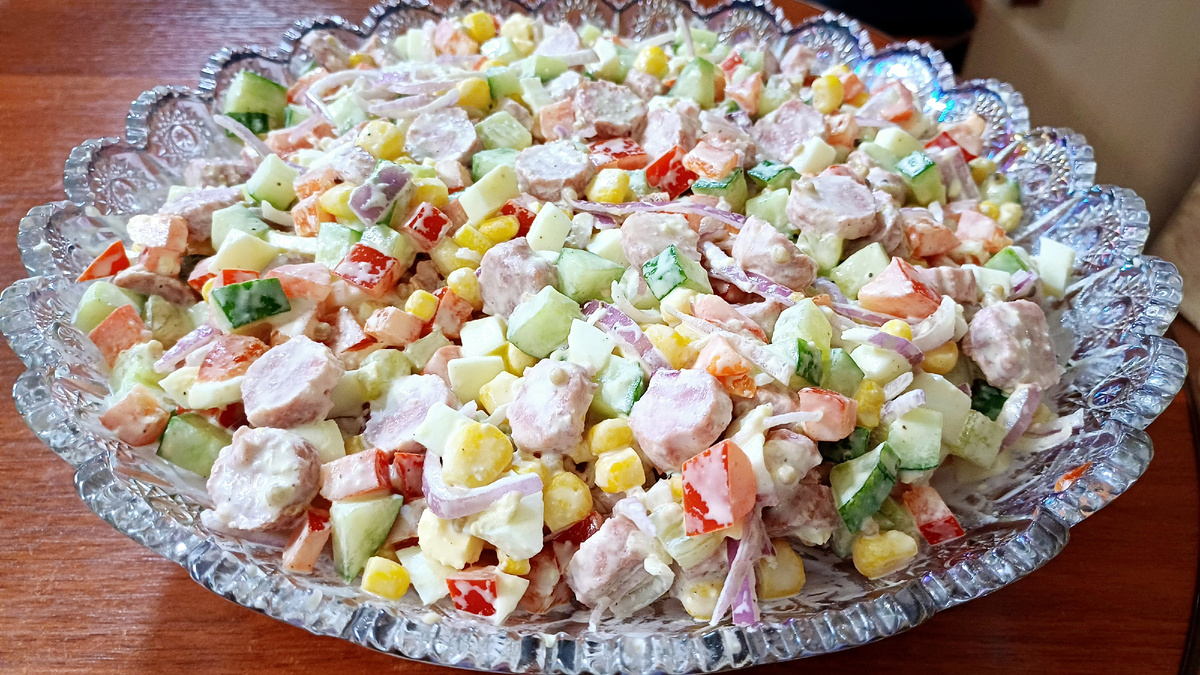 Всем привет! Я к вам с рецептом вкусного,красивого и сочного салата "Радуга"👍😋 И так начинаем готовить. Три варёных яйца режем кубиком. Далее один свежий огурец так же режем кубиком. Консервированная кукуруза отправляется в салат. Красный салатный лук режем тонкой соломкой и добавляем в салат. Один спелый красный сладкий перец режем кубиком. Охотничьи колбаски очищаем от оболочки,режем колечками и добавляем в салат. Заправляем майонезом,зернистой горчицей,солим и перчим. Всё перемешиваем и салат "Радуга" готов. Красота и вкуснота👍😋 Салат получается сочный,красивый,яркий и очень вкусный. Приятного аппетита! Всем хорошего дня и отличного настроения!